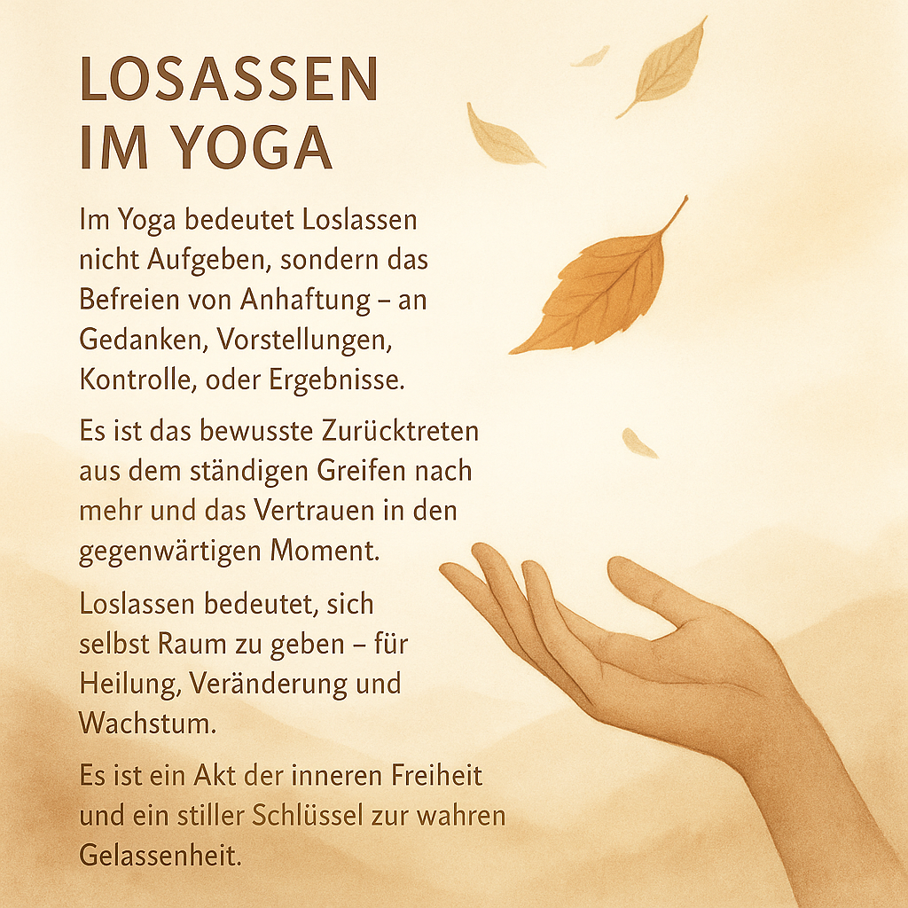 Im Yoga bedeutet Loslassen (Sanskrit: vairāgya) nicht Aufgeben, sondern das Befreien von Anhaftung – an Gedanken, Vorstellungen, Kontrolle, oder Ergebnisse. Es ist das bewusste Zurücktreten aus dem ständigen Greifen nach mehr und das Vertrauen in den gegenwärtigen Moment.